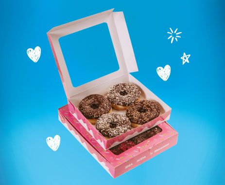 Izaberi odgovarajuću kutiju i napuni je sa 4 ili 6 omiljenih krofni, po ceni kutije za samo 1 dinar!*