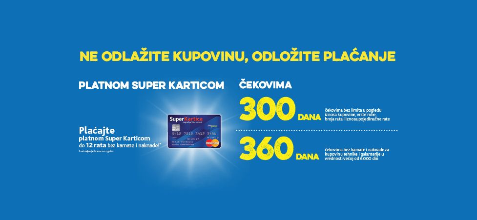 Takođe, za kupovinu tehnike, tekstila i galanterije, za pojedinačnu kupovinu preko 6.000,00 dinara potrošačima je dostupno odloženo plaćanje čekovima do 360 dana u jednakim uzastopnim mesečnim ratama.
